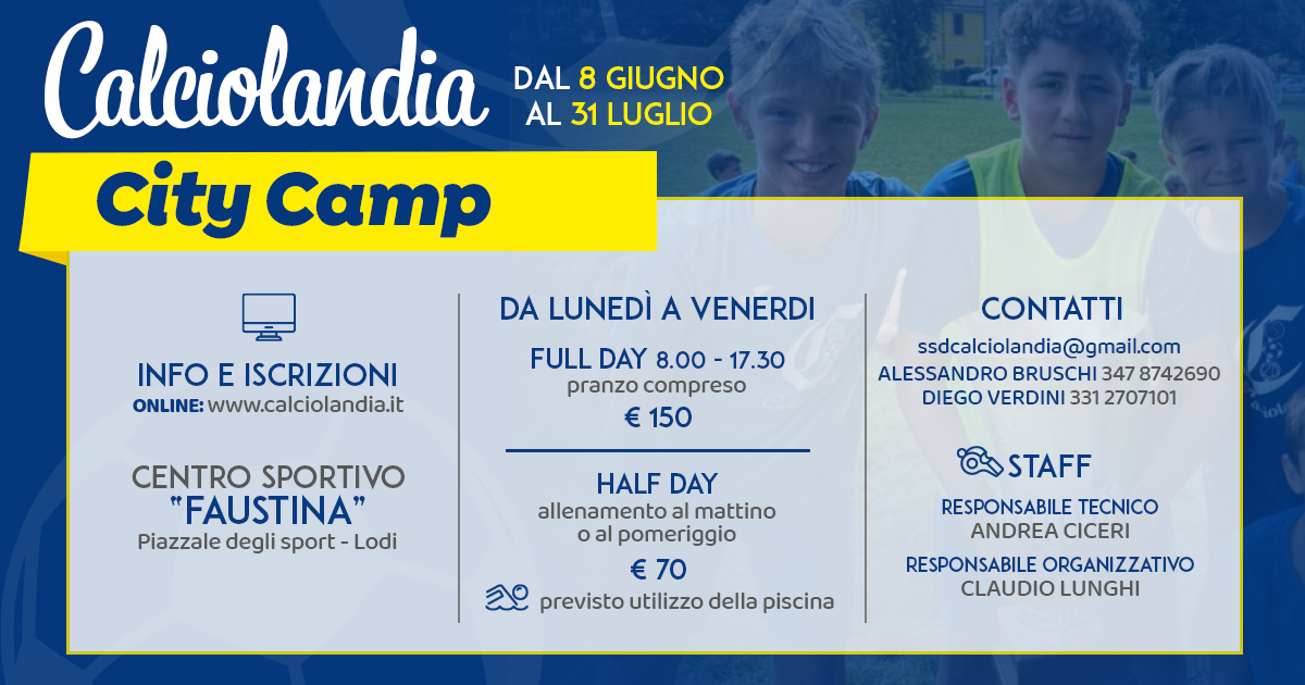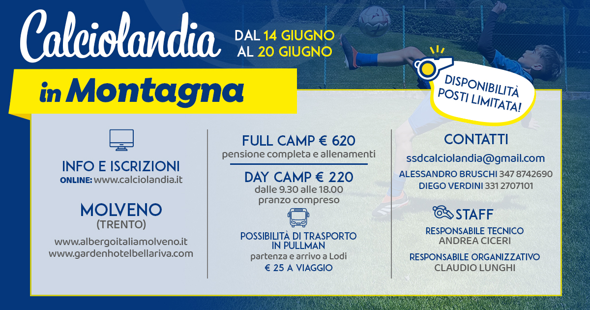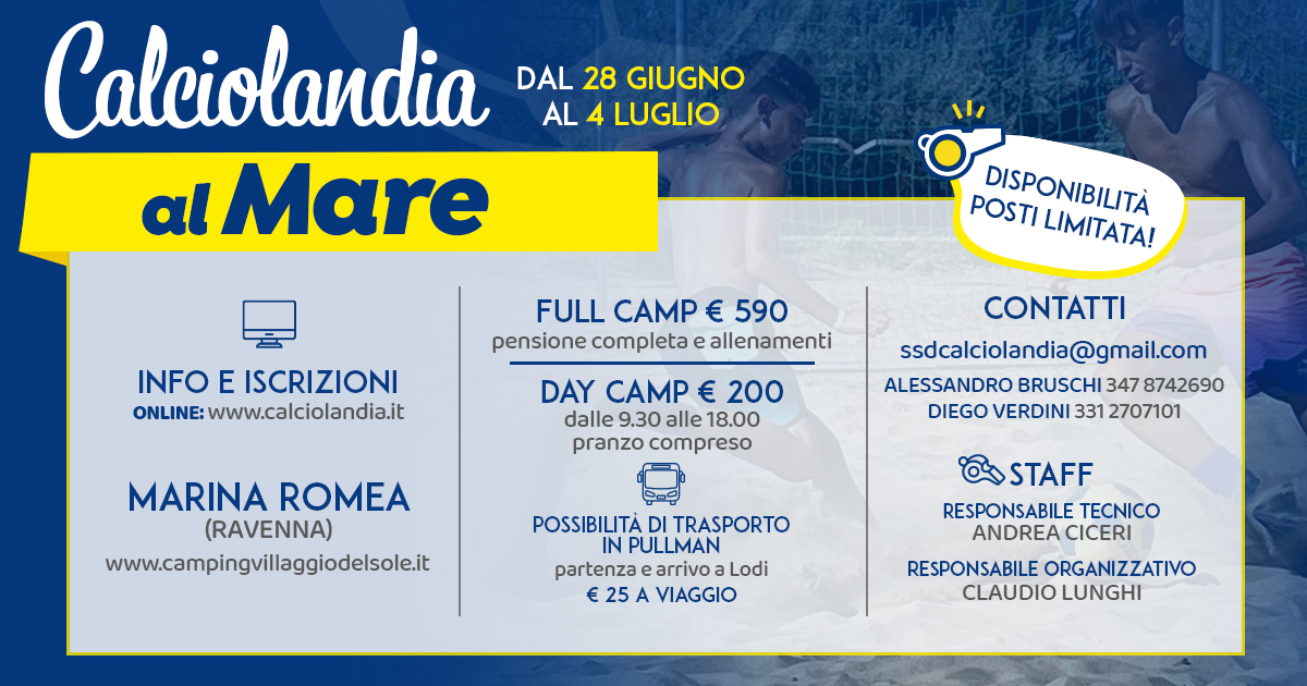 Dichiara di essere a conoscenza delle disposizioni vigenti in materia di tutela sanitaria delle attività sportive e degli obblighi conseguenti compreso l’obbligo di presentazione del certificato medico. In merito al contratto di assicurazione stipulato da SSD CALCIOLANDIA a favore dei partecipanti dei campi, accetta e con la firma dell’iscrizione rilascia dichiarazione liberatoria rinunciando a qualsiasi risarcimento danni eccedenti al valore dei massimali concordati. Inoltre, dichiara di sollevare gli organizzatori da ogni responsabilità derivante da infortuni o altro durante il periodo e per tutte le attività del campo, concede assenso alla partecipazione a eventuali gite e trasferimenti utilizzando mezzi privati o pubblici.